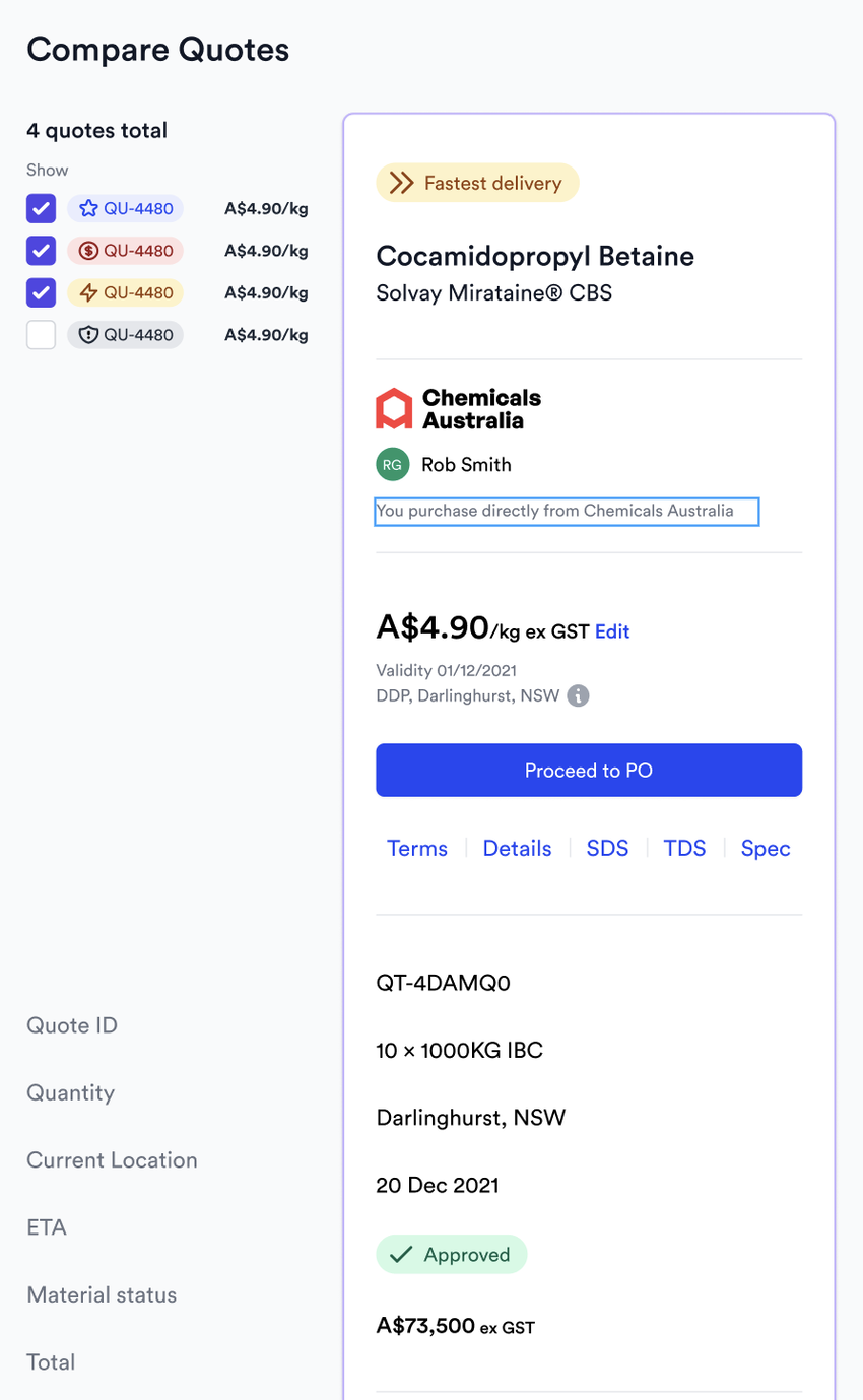 For ChemCloud Connect customers, when looking at a quote, it is important to know if I have a Direct Relationship with the supplier (and if I am dealing with my account manager) or if this supplier is Managed by ChemCloud. We have made this clearer on the quote card.
